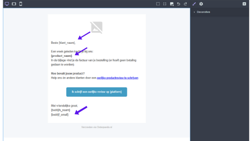 Stap 4 – De tekstvelden zoals {bedrijfs_naam} betekent dat op deze plekken de gegeven automatisch ingevuld worden. Dit worden ook wel ‘Dynamische velden’ genoemd. Op het moment dat de mail verstuurd wordt, worden de gegevens van de klant, en het bestelde product automatisch ingevuld.