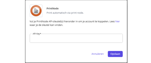 Stap 3 – Je krijgt onderstaande pop-up in beeld. Hier wordt gevraagd om de API-Key die je net hebt opgevraagd bij Printnode. Vul deze in en klik op ‘Opslaan‘.