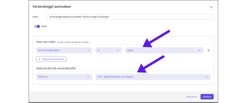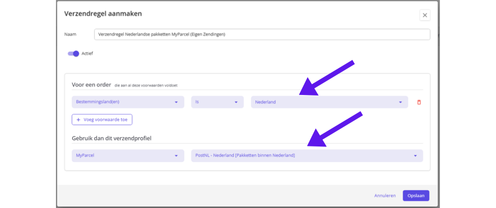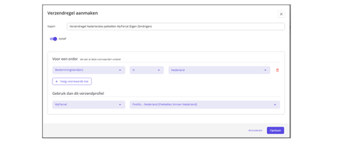 Eerst zet je de voorwaarden erin. Hier kun je bijvoorbeeld instellen dat pakketten binnen Nederland met verzendprofiel 1 verstuurd moeten worden, en buiten Nederland met verzendprofiel 2.